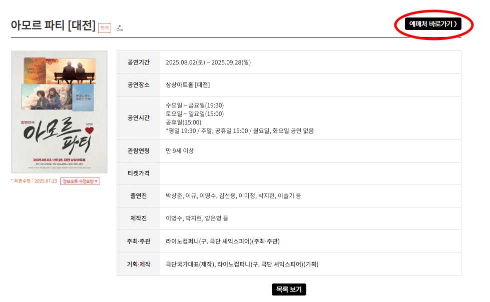 원하는 공연 클릭하면 → 오른쪽 상단 ‘예매처 가기’ 누르면 바로 연결된다.